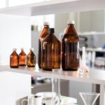 Laboratory bench with pipettes and reagent bottles
