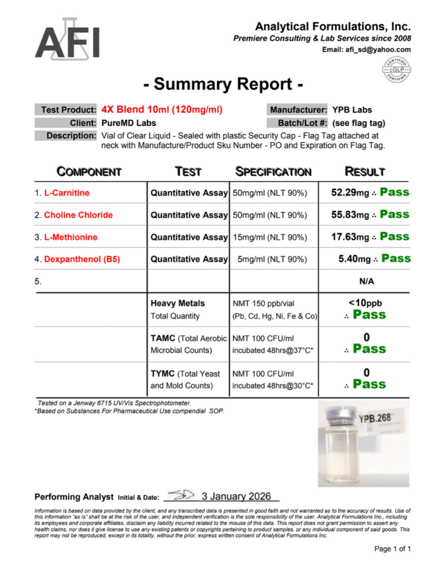 4X Blend Methionine (15mg) / Choline Chloride (50mg) / Carnitine (50mg) / Dexpanthenol (5mg)