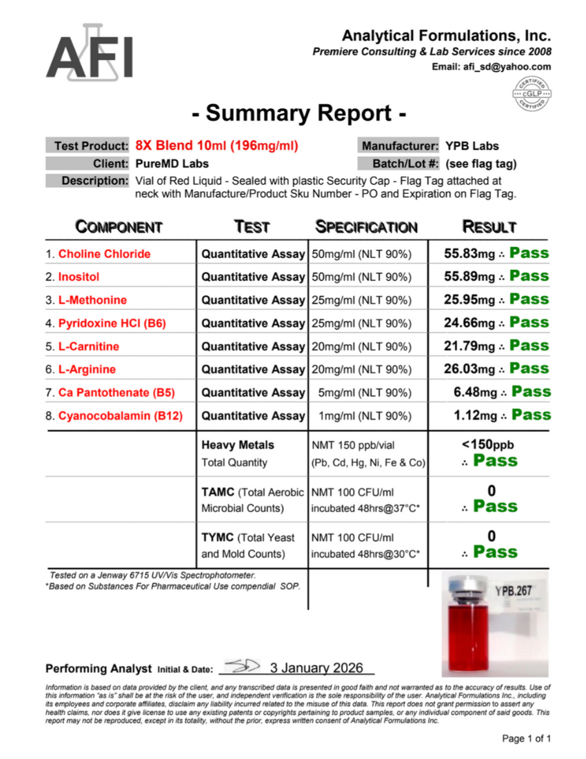 A multi-component research material supplied for controlled research environments. This 8X blend contains a synergistic combination of amino acids, vitamins, and cofactors designed for research into metabolic function, methylation pathways, and nutrient interaction studies in controlled laboratory settings.