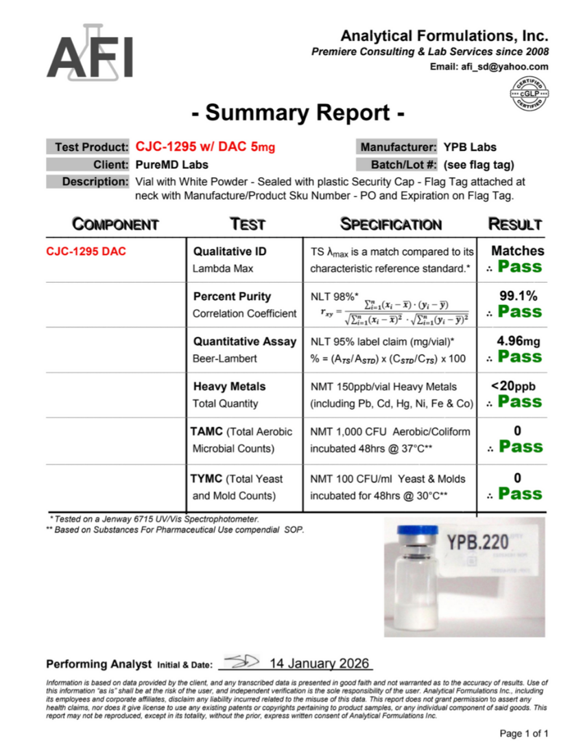 Every batch undergoes independent third-party laboratory analysis to verify identity, potency, and safety. Testing includes quantitative assay verification, heavy metals screening, and comprehensive microbial analysis.