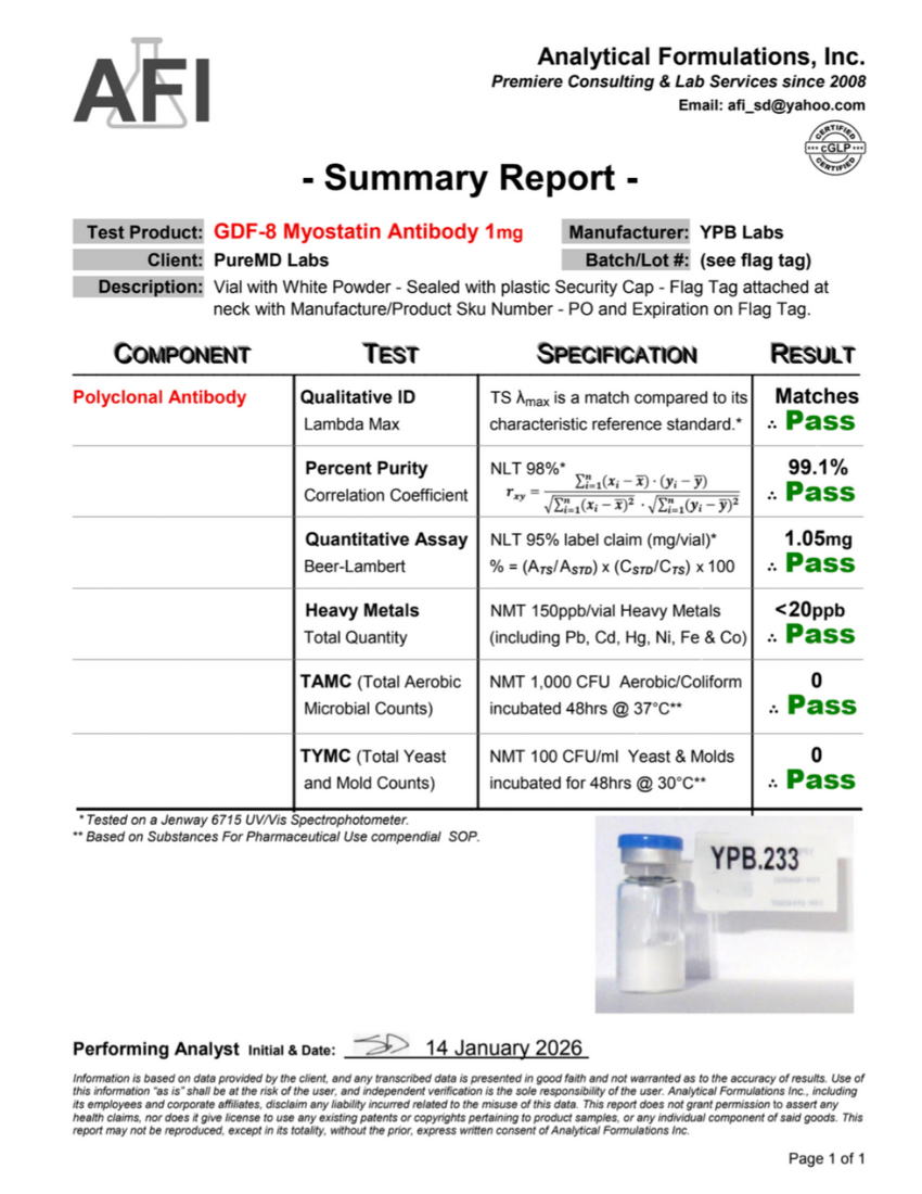 Every batch undergoes independent third-party laboratory analysis to verify identity, potency, and safety. Testing includes quantitative assay verification, heavy metals screening, and comprehensive microbial analysis.