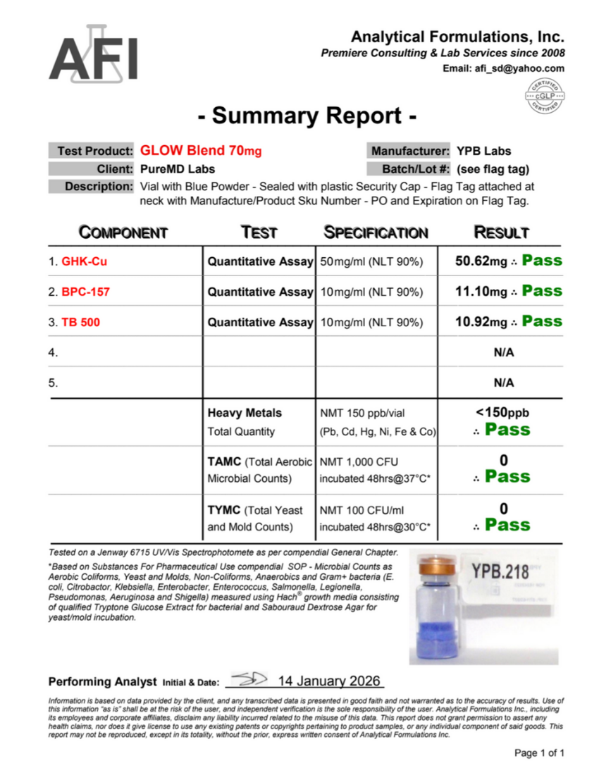 Every batch undergoes independent third-party laboratory analysis to verify identity, potency, and safety. Testing includes quantitative assay verification, heavy metals screening, and comprehensive microbial analysis.