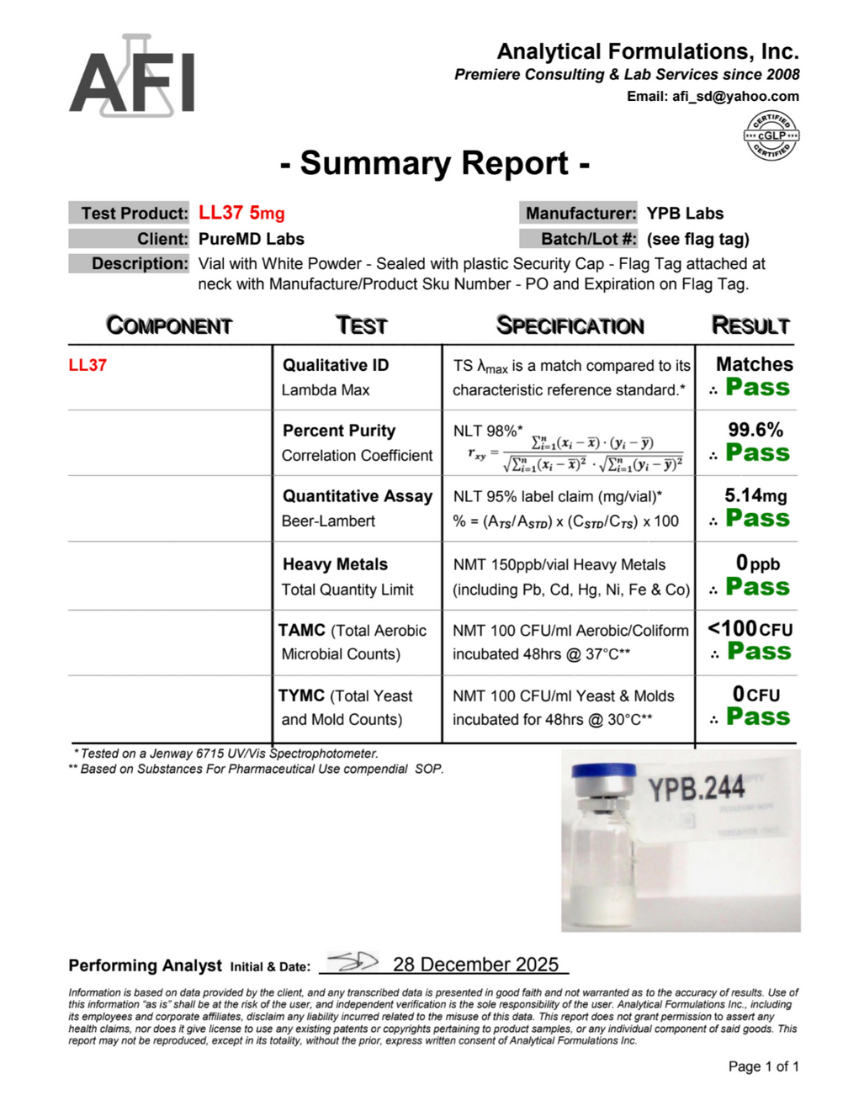 A single-component research material supplied for controlled research environments. LL-37 is a synthetic cathelicidin-derived peptide used in research exploring innate immunity, antimicrobial pathways, and wound-healing models in controlled systems.