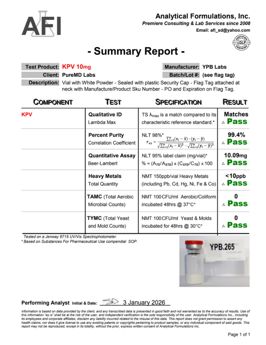 Every batch undergoes independent third-party laboratory analysis to verify identity, potency, and safety. Testing includes quantitative assay verification, heavy metals screening, and comprehensive microbial analysis.