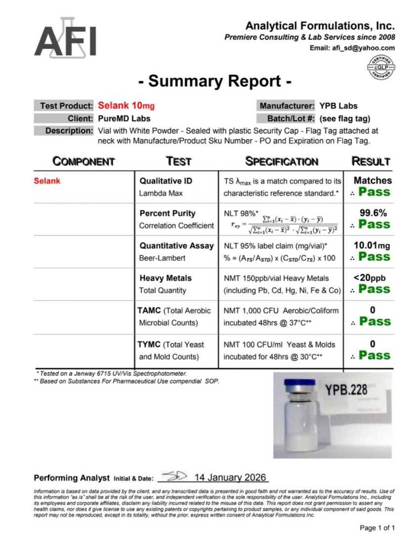 Every batch undergoes independent third-party laboratory analysis to verify identity, potency, and safety. Testing includes quantitative assay verification, heavy metals screening, and comprehensive microbial analysis.