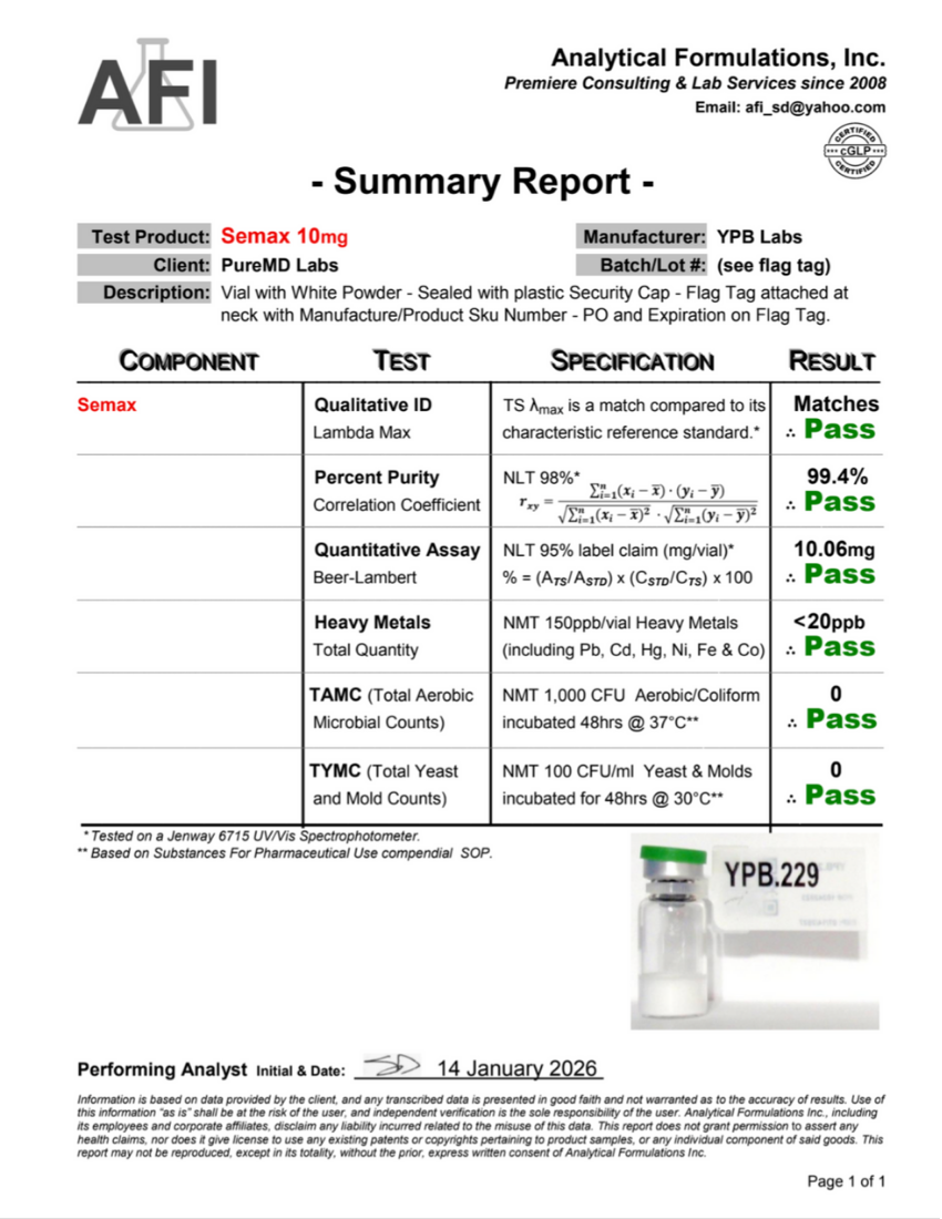 Every batch undergoes independent third-party laboratory analysis to verify identity, potency, and safety. Testing includes quantitative assay verification, heavy metals screening, and comprehensive microbial analysis.