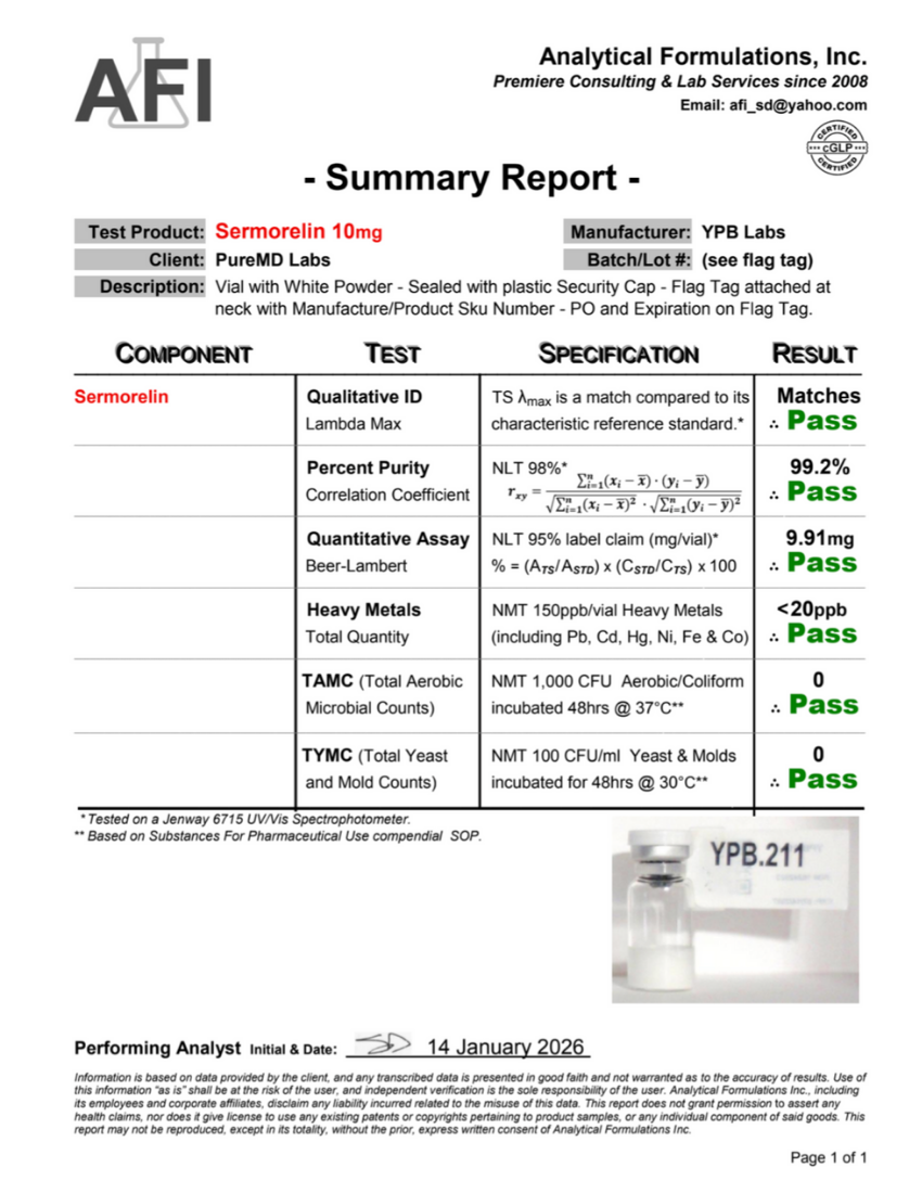 Every batch undergoes independent third-party laboratory analysis to verify identity, potency, and safety. Testing includes quantitative assay verification, heavy metals screening, and comprehensive microbial analysis.